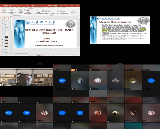 根据山东财经大学青年骨干教师境外研修重点支持计划的工作安排,经学院审批,2021年12月2日下午,国际经贸学院赵明亮老师通过腾讯会议(会议号: 970764201),在线开放为国际经贸及相关学院师生进行了一场题为“纽约州立大学布法罗分校研修心得”的英文学术报告。
