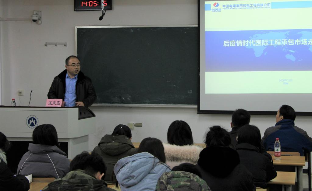 12月23日下午,国际经贸学院在舜耕校区3208教室举办了题为“后疫情时代国际工程承包市场走势与应对策略”的专题讲座,主讲嘉宾为我院国际商务硕士校外合作导师、中国电建集团核电工程有限公司国际工程公司王风亮经理。讲座由国际经贸学院副院长朱庆华教授主持讲座,全体2020级国际商务硕士研究生参加。