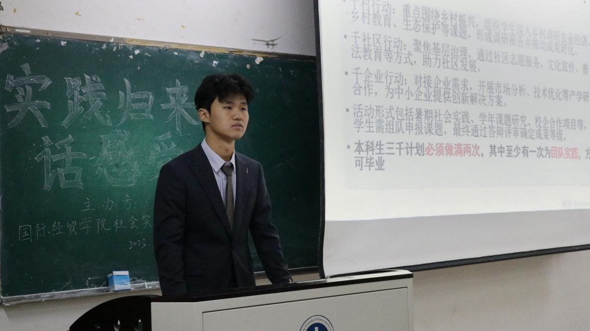 为展示学院“三千计划”实践成果,分享鲜活经验,激发同学参与热情,帮助同学深入理解社会实践核心内涵,11月10日晚,国际经贸学院于章丘校区成功举办2025年社会实践“三千计划”实践归来话感受分享会。会上邀请学院在2025年社会实践“三千计划”中获得校级重大立项的代表团队队长及核心队员,为2024和2025级同学分享宝贵经验。