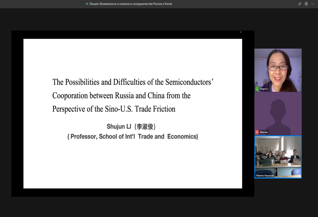 4月15日,我院李淑俊教授受邀为俄罗斯联邦政府财政金融大学(俄财大)国际经济关系学院师生开展了一场题为《The Possiblity and Difficulty of the Semiconductors' Cooporation between Russia and China in the Perspective of Sino-U.S.Trade Friction》的讲座。此次讲座主要围绕中美经贸摩擦背景下,中俄两国在半导体产业进行合作的可能性和落地障碍。本次讲座采取线上的方式,由俄财大国际经济关系学院副院长玛丽娜教授主持。