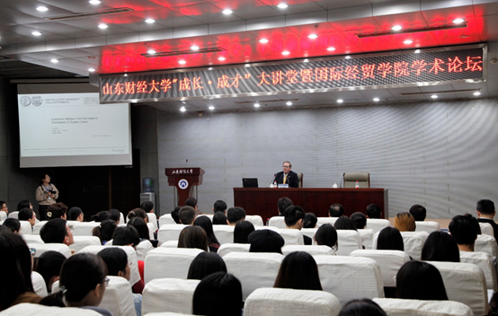 3月27日下午,由我院承办的“成长•成才”大讲堂第212期暨国际经贸学院学术论坛在舜耕校区举行。德国哈勒-维滕贝格大学教授卜玉洗(Ulrich Blum)先生作题为“Economic Warfare: From Free Trade to Dominance of Supply Chains”的主题演讲。校长赵忠秀会见客人并出席讲座。我院师生代表约300人聆听了演讲。