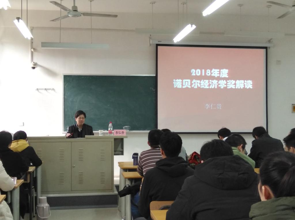 李仁贵主任首先由2018年诺贝尔经济学奖得主威廉·诺德豪斯(William D. Nordhaus)和保罗·罗默(Paul M. Romer)引出一个问题——为什么他们可以一起获奖?接着就威廉·诺德豪斯和保罗·罗默在增长理论里分别做出的贡献找到两者的共同点,解释了两位诺贝尔奖得主为何会一起获奖。之后,李主任还进行了诺贝尔经济学奖相关知识拓展,包括顶级高校的“培育篮”是什么、各种诺贝尔奖及相关奖英文名称对比以及诺贝尔奖提名规则和奖励规则等。最后,参会同学及老师与李主任进行了思想交流,并谈到了期刊的发表流程以及如何选题等十分切合学生实际的问题。
