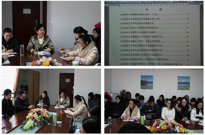 为全面深入了解研究生的学习、生活和思想状况,进一步做好研究生管理和服务工作,国际经贸学院党委副书记张桂美和研究生辅导员滕晖老师,于2015年1月26日上午召开了2014级博士、硕士研究生学习生活专题座谈。