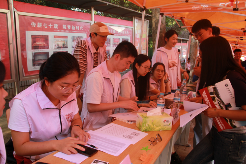 在迎新现场,陆续到达的新同学们受到学长学姐们的热情迎接,感受到学院大家庭的温暖。迎新现场,虽然已是9月,但天气依旧炎热,而志愿者们不惧炎热的天气,有条不紊地帮助新生办理入学手续。他们有的在迎新点处统计基本信息、发放新生礼包,有的帮助新生将行李运往宿舍,用心周到的服务让新同学们倍感亲切。学院特意为新生准备了“时光邮筒”“心愿箱”,引导新同学在迎新现场写下自己的美好心愿。另外,迎新点附近的展板则为新生们详细地介绍了学院概况、学科建设、学团工作、毕业生去向等内容,让他们对学院和所学专业有着进一步了解。此外,学院还为新生精心设计了T恤、卡套、贴纸等文创礼物,让新生切身感受到学院的关爱和文化风采。