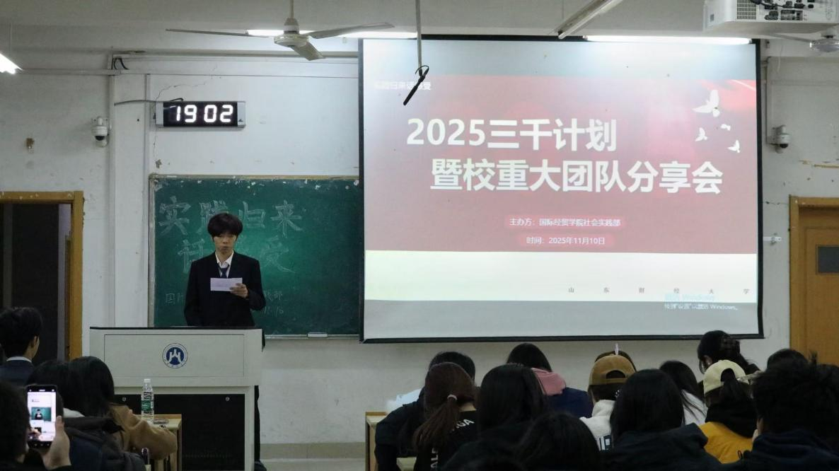 为展示学院“三千计划”实践成果,分享鲜活经验,激发同学参与热情,帮助同学深入理解社会实践核心内涵,11月10日晚,国际经贸学院于章丘校区成功举办2025年社会实践“三千计划”实践归来话感受分享会。会上,邀请了学院2025年社会实践“三千计划” 中表现突出的优秀队伍,为2024级、2025级同学分享实践经验与成长收获。