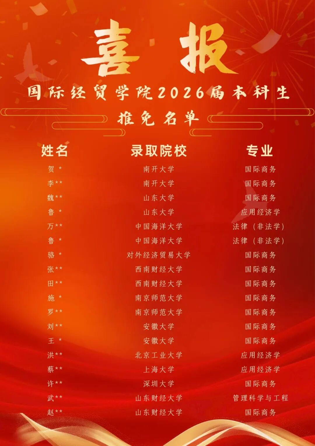 桂香扑满书页,秋阳暖透校园。国际经贸学院又迎来了属于青春的荣耀时刻——在2026年度推荐优秀应届本科毕业生免试攻读硕士学位研究生工作中,学院学子凭借过硬的综合素养,成功斩获南开大学、山东大学、对外经济贸易大学等多所国内知名高校的推免录取资格。这些学子通过大学期间不懈的努力,为自己的本科生涯交出了亮眼答卷。