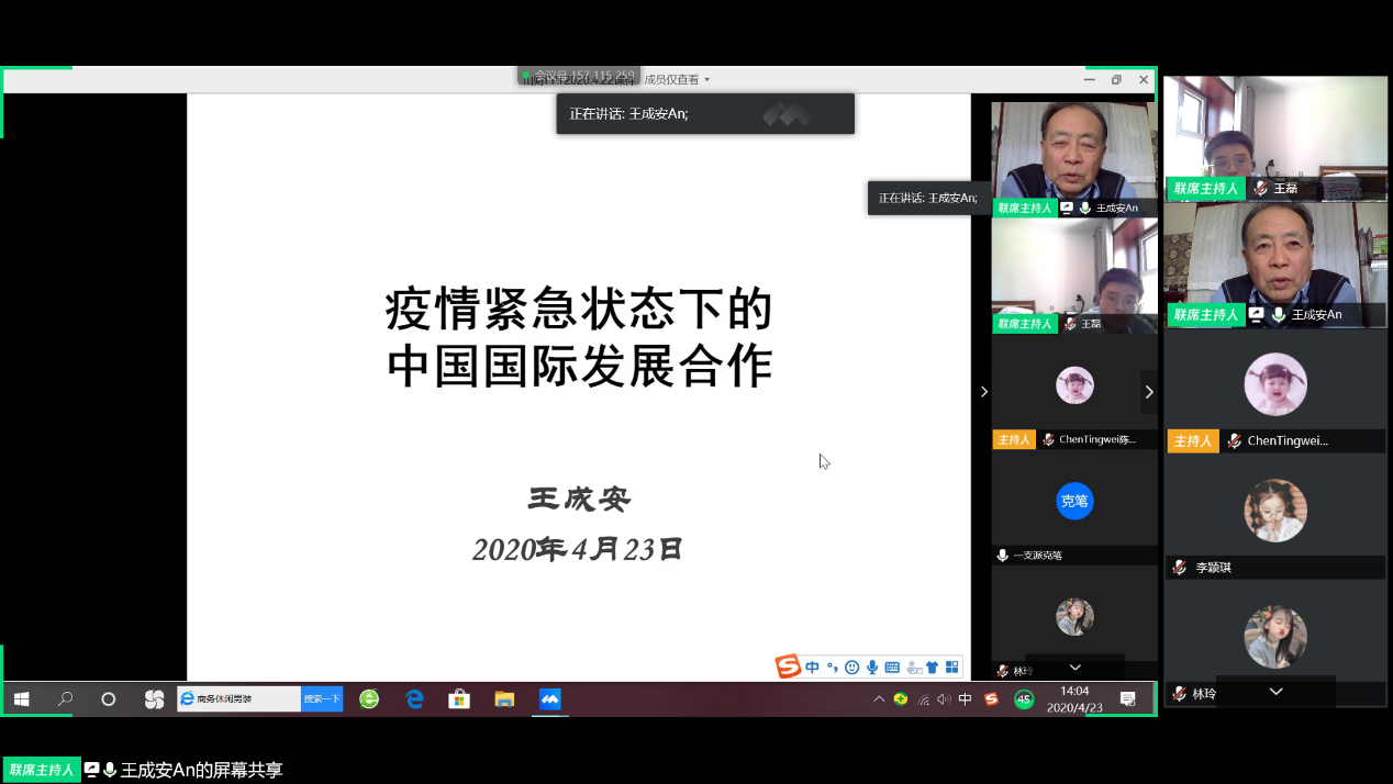 4月23日下午,商务部援外司原副司长、资深翻译家、我校顾问教授王成安先生应邀为我校国际发展合作本科创新实验班和研究生创新实验班的同学们作线上授课。
