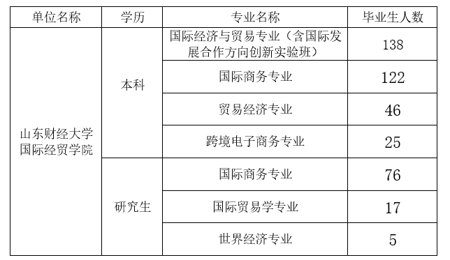 山东财经大学国际经济与贸易专业于1960年开办,是国内较早开设对外贸易专业院校之一。1998年获山东省首家国际贸易学硕士授权点;2013获批国际贸易学博士学位授权点;2016年,国际贸易学所在的一级学科应用经济学获评山东省立项建设一流学科;2017年,教育部学位与研究生教育发展中心公布了第四轮学科评估结果,应用经济学被评为B+学科。其中,国际贸易理论方向侧重新新贸易理论、区域经济一体化理论以及全球价值链理论的研究;国际贸易政策方向侧重“一带一路”经贸合作、自由贸易试验区建设、贸易摩擦等的研究;中国对外贸易方向侧重中国商品贸易、服务贸易及其质量等的研究。本学科点培养的研究生应掌握本专业坚实的基础理论知识和系统的专门知识,具有从事科学研究的能力或独立担负专门技术工作的能力;熟练地掌握一门外国语,能阅读本专业该语种的外文资料,并具有较强的外语写作能力和国际学术交流的能力。本专业毕业生可胜任涉外经济贸易部门、企事业单位和政府机构实际业务操作、管理、调研和宣传策划以及国际经贸领域学术研究等工作。