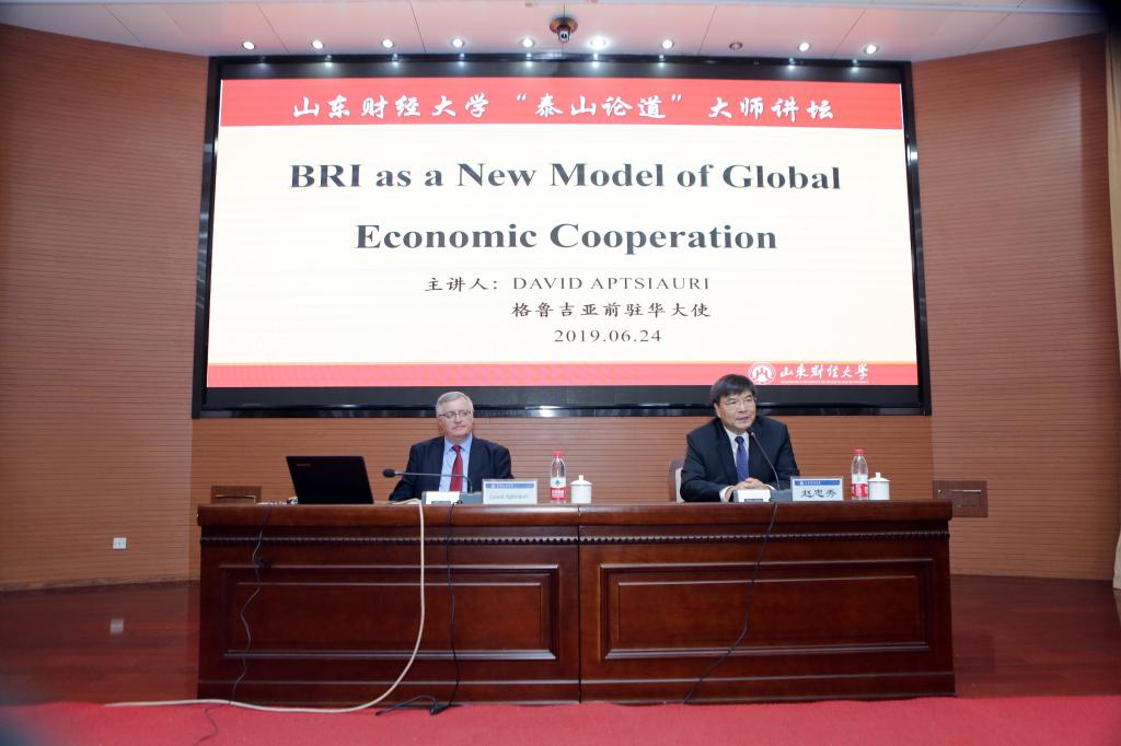 6月24日上午,阿普恰乌利先生在“泰山论道”大师讲坛为我校300余名师生作了题为“BRI as a New Model of Global Economic Cooperation”的主题演讲。校长赵忠秀出席并为讲坛致辞。他表示十分荣幸能邀请阿普恰乌利大使来到山东财经大学的大师讲坛,大使先生将从一个全新的角度探讨中国的“一带一路”倡议,希望同学们能够用全球化的视野来看待中国的发展战略并得出自己正确的理解。