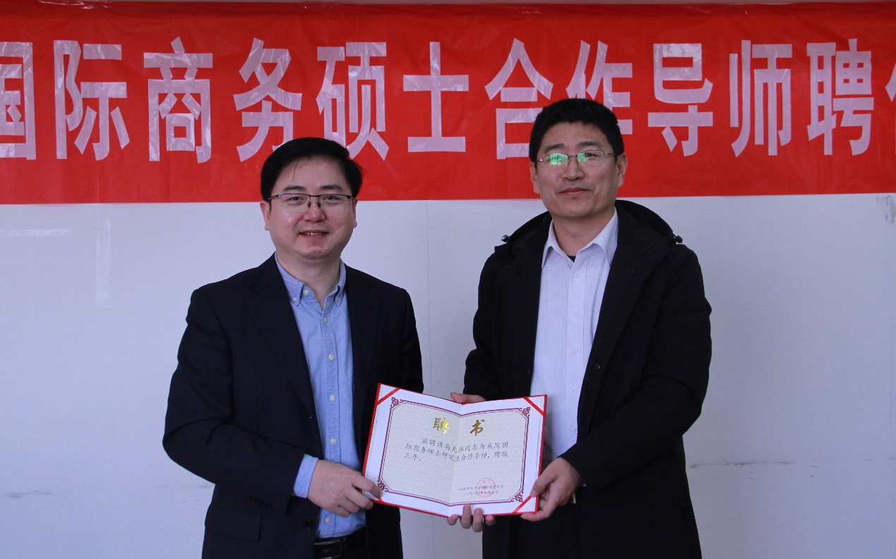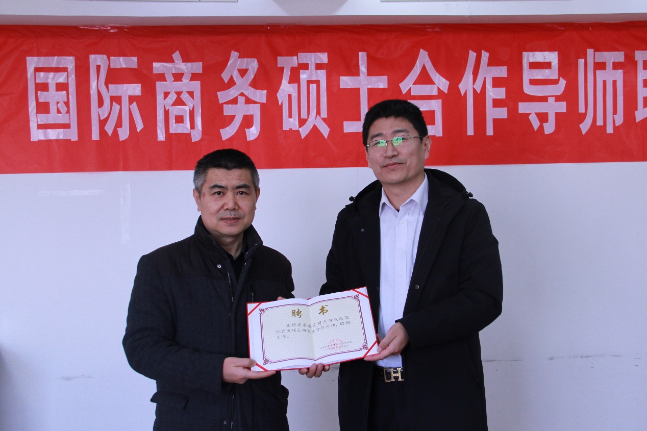 签字仪式后,徐书记代表国际经贸学院,向马光伟主任和李海民副主任颁发了国际商务硕士校外合作导师聘书。