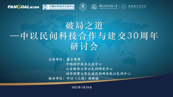 2022年3月18日,盘古智库、中国科学技术交流中心、山东财经大学山东以色列研究中心、对外经贸大学区域国别研究院以色列中心、中以(上海)创新园共同组织,在盘古智库亚投行办公区召开了“破局之道—中以民间科技合作与建交30周年”研讨会。会议采取线上线下相结合的形式,邀请了相关领域知名专家,针对当前国际局势变化、中以科技协作等内容进行研讨,我校校长赵忠秀出席会议并致辞,学院刘新英、韩忠先老师参会。