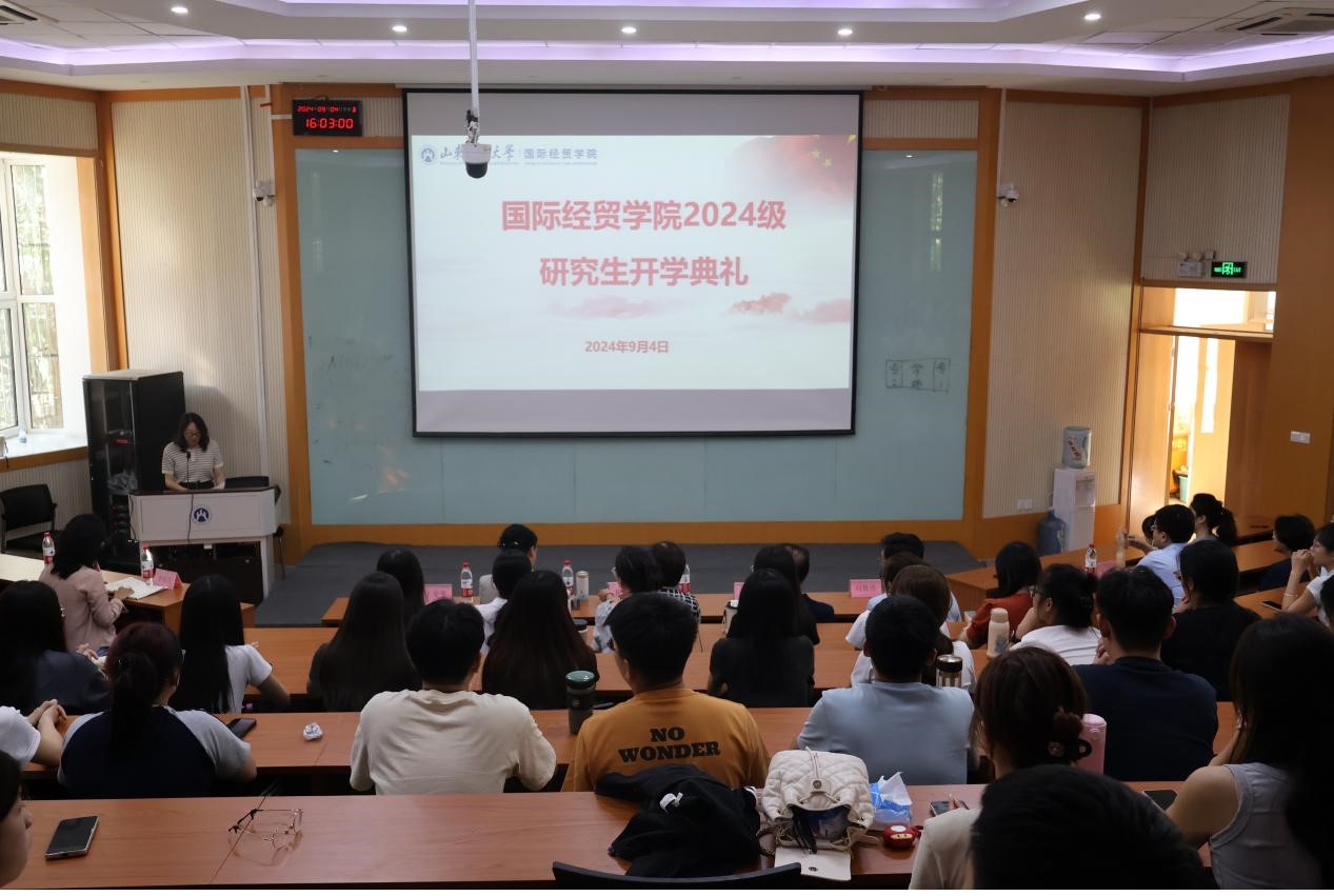 9月4日,国际经贸学院2024级研究生开学典礼在舜耕校区第三阶梯教室举行。国际经贸学院党委书记崔东峰,院长方慧,副书记郝秀峰、王斐斐,副院长刘鲁浩,院长助理王磊、段国蕊,研究生秘书王凤银,研究生辅导员李瑞雪及全体2024级研究生参加了典礼。典礼由学院党委副书记王斐斐主持。