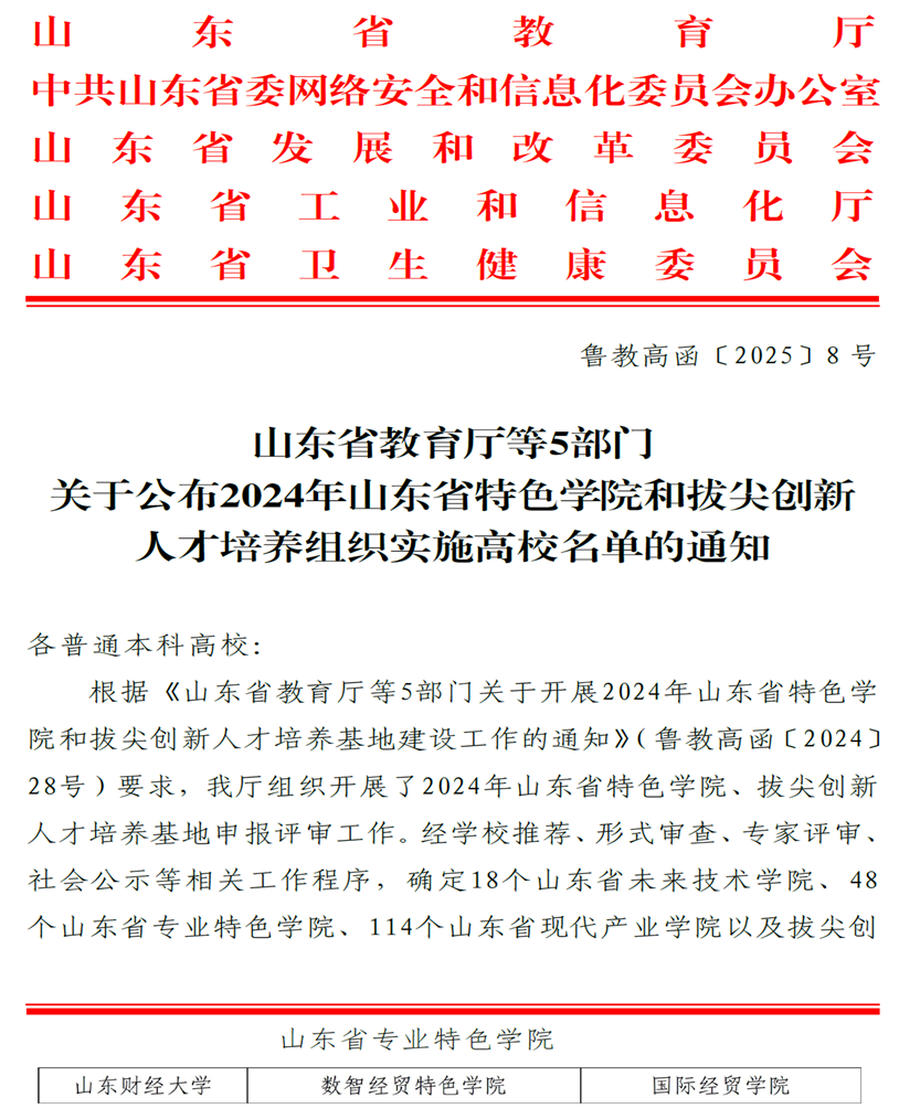 近日,山东省教育厅等5部门公布了2024年山东省特色学院和拔尖创新人才培养组织实施高校名单。我校获批1个省级专业特色学院,2个现代产业学院,并入选省级普通高等学校急需领域拔尖创新人才培养组织实施高校。我院申报的“数智经贸特色学院”获批山东省专业特色学院。