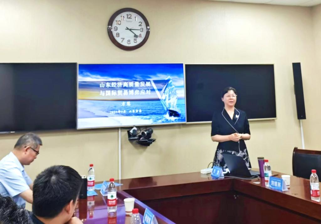 在演讲中,方慧教授结合当前全球经济形势和国际贸易格局的变化,深入分析了山东省在“双循环”新发展格局下面临的机遇与挑战。她指出,山东作为沿海经济大省,应充分发挥产业优势,深度融入“一带一路”建设,推动外贸外资高质量发展,同时加强科技创新,抢占全球价值链高端位置。她还强调,面对国际贸易摩擦和供应链重构,山东企业需提升风险应对能力,优化全球市场布局,并借助自贸区政策红利,增强国际竞争力。
