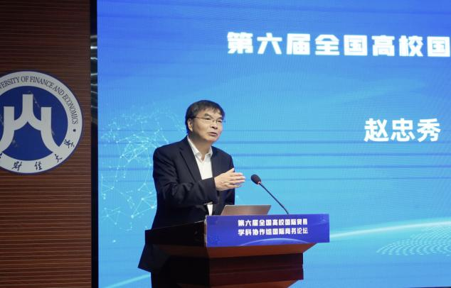 对外经济贸易大学校长、全国高校国际贸易学科协作组副秘书长赵忠秀致辞,祝贺论坛召开,感谢山东财经大学的筹备。他肯定协作组在学科建设和服务国家战略方面的成果,指出本届论坛适逢协作组成立二十周年,意义重大,呼吁同仁携手构建中国特色的国际商务学科体系。