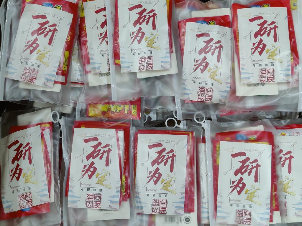 “征程在即,暖意相随”。在全国硕士研究生招生考试进入最后冲刺的关键阶段,为鼓舞考研学子斗志,缓解备考压力,近日,国际经贸学院联合光华园考研机构开展了考研送温暖活动,向紧张备考的学子送去诚挚的关怀与祝福。