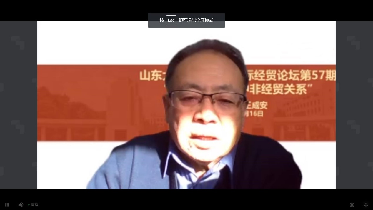 12月16日上午,由山东大学经济学院和山东财经大学国际经贸学院联合主办的“后疫情时期的中非经贸关系”主题讲座以线上会议形式举行。中葡经贸合作论坛前秘书长、资深翻译家、我校顾问教授王成安老师为同学们授课。我校组织国际发展合作创新实验班的同学们在圣井校区集中聆听了王教授的线上课程。