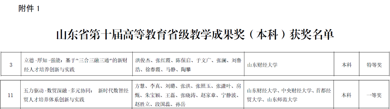 近日,山东省教育厅印发《第十届高等教育省级教学成果奖获奖名单的通知》(鲁教高函〔2025〕30号),我院两项本科教学成果喜获佳绩。其中,洪俊杰教授主持的《立德·厚知·强能:基于“三合三融三通”的新财经人才培养创新与实践》荣获特等奖,方慧教授主持的《五力驱动·数贸深融·多元协同:新时代数智经贸人才培养体系创新与实践》荣获一等奖。