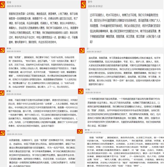观看《榜样致敬老英雄》过程中,各支部全体党员积极开展在线讨论交流,谈收获、谈体会、谈打算,并及时向党支部报告学习情况。通过本次学习,国际经贸学院的全体党员加深了对习近平总书记所说的“中华民族是崇尚英雄、成就英雄、英雄辈出的民族,和平年代同样需要英雄情怀。”的理解,纷纷表示会铭记一切为中华民族做出贡献的英雄们,坚定捍卫英雄、学习英雄、关爱英雄的决心,不断增强民族自尊心、自信心和自豪感,勠力同心为实现“两个一百年”奋斗目标、实现中华民族伟大复兴的中国梦而努力奋斗!