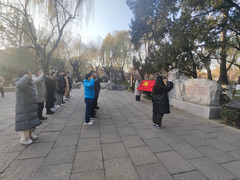 在美铭广场,全体党员面向党旗庄严宣誓,重温入党誓词,感悟初心使命。